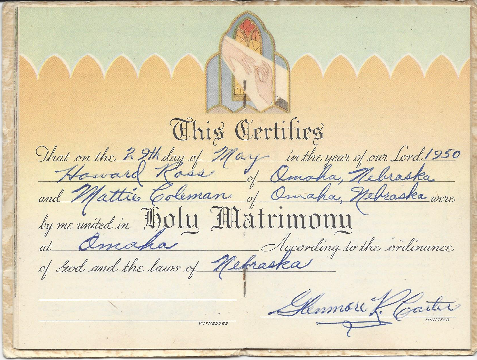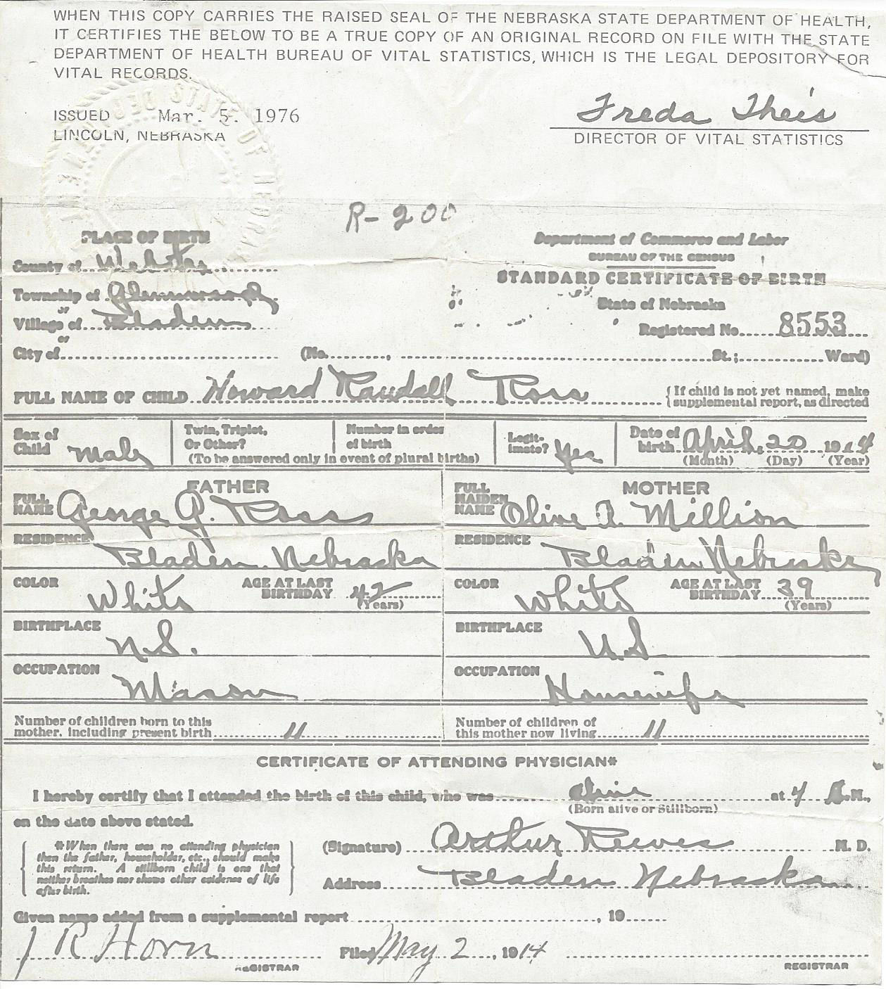 Howard was a bricklayer by trade, requiring him to “go where the work was.” The family moved a great deal, living in Tekamah and Omaha, Nebraska; and Hoisington, Larned, Great Bend, Newton, Kansas.